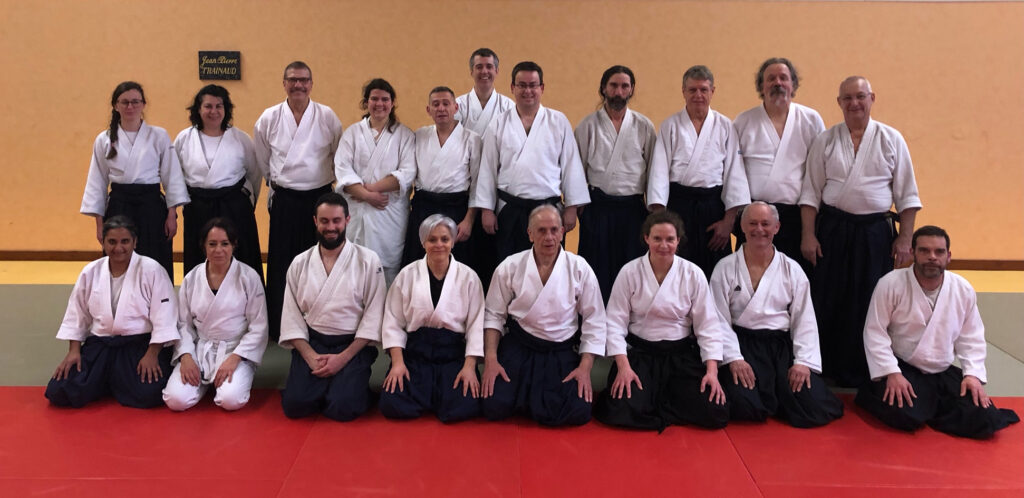 Après un échauffement visant à favoriser les déplacements ainsi que le mouvement, c’est tout d’abord un travail à mains nues qui a été amorcé : en posture « suwari waza » dans un premier temps, sur plusieurs saisies dans le but de travailler sur différentes distances ainsi que de mobiliser le centre ; puis une continuité du travail en « tachi waza », en essayant de garder à l’esprit la précision ainsi que la fluidité du corps.
