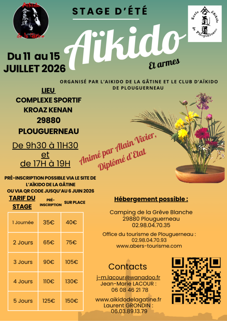 Organisé par le club d’Aïkido de la Gâtine ainsi que l’école d’Aïkido de Plouguerneau et animé par notre enseignant Alain Vivier, le stage d’été se déroulera du 11 au 15 juillet 2026 au Complexe sportif de, Kroaz Kenan, 29880 Plouguerneau. Retrouvez toutes les informations dans l’affiche ci-dessous :